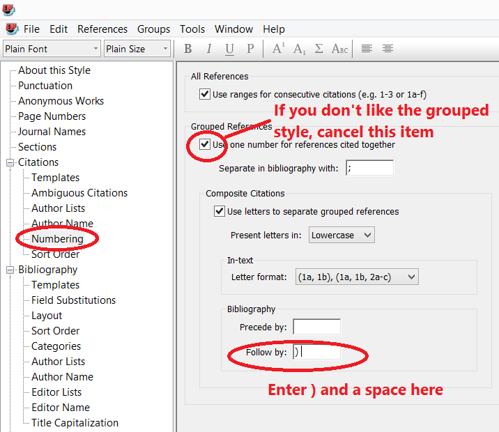 In the Bibliography group box, enter ) and a space in the “Followed by” textbox. This means to add the missing “) “ behind the sequence marks a, b, c, etc. If you don’t want Endnote show your references in a grouped manner, simply cancel the item “Use one number for references cited